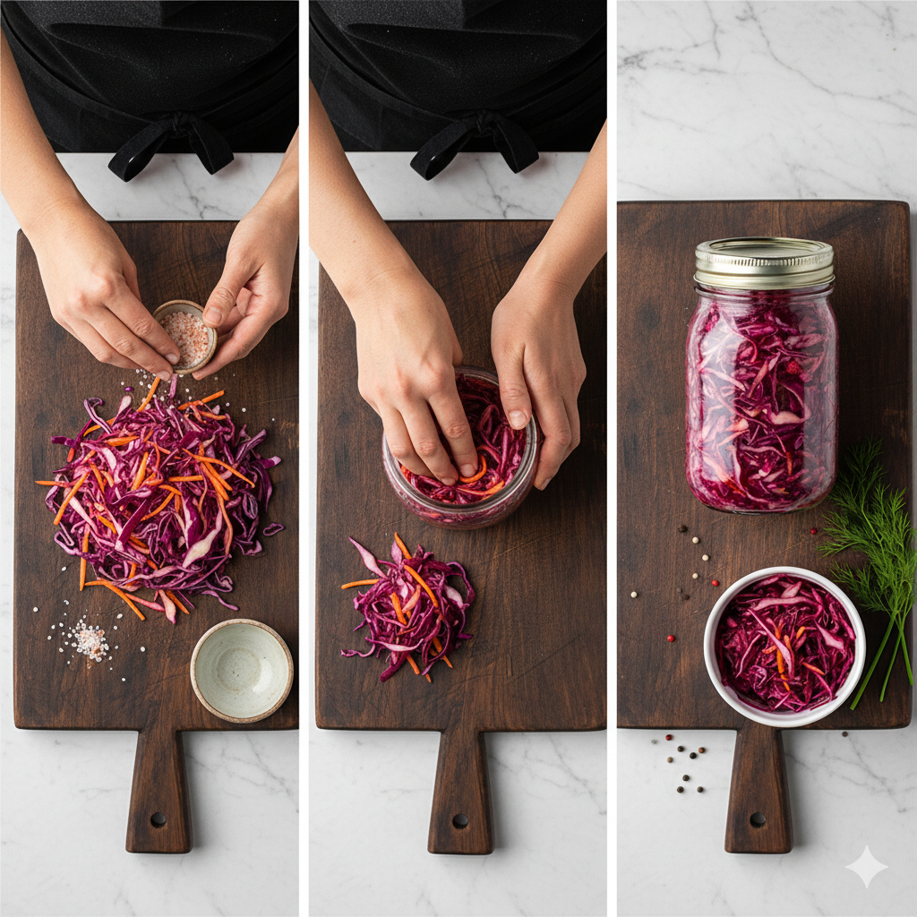 İpucu: Başlangıç için sade karışımlar — lahana + havuç en risksiz kombinasyon. Hijyen kuralı: Küf, ağır koku, gri kaygan yüzey = Çöpe at. Profesyonel mutfaklarda fermente eşlikçiler kontrollü koşullarda hazırlanır, standart süre ve tuz oranıyla stabil kalite korunur.