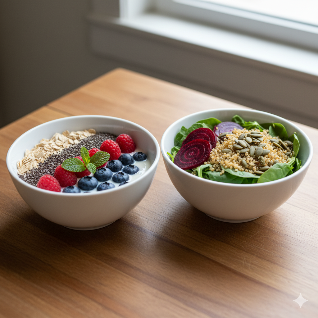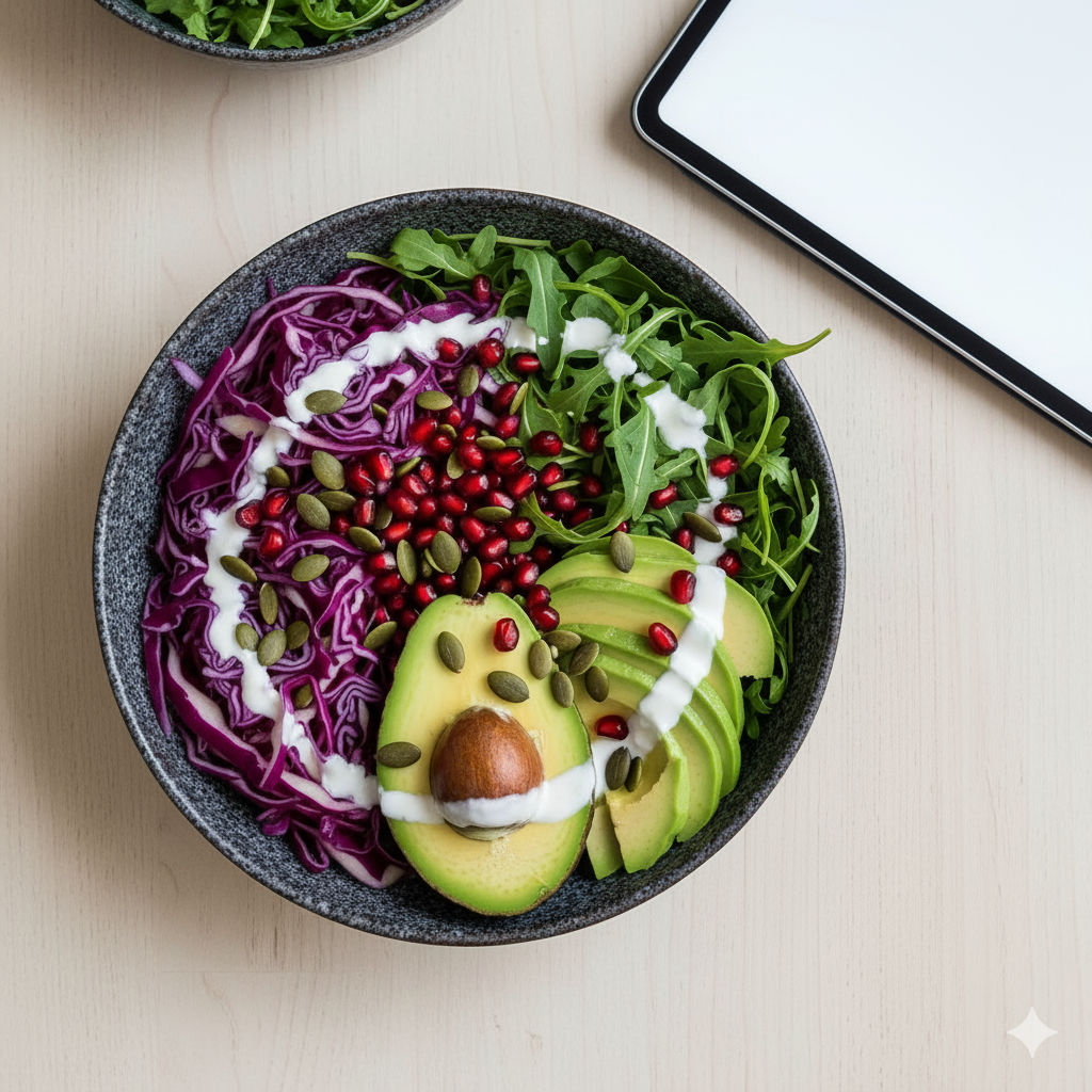➤ Örnek tabak: Renkli antioksidan tabağı Mor lahana, roka, avokado, kabak çekirdeği, nar taneleri ve yoğurt bazlı hafif bir sos. Bu tabak hem bağırsak sağlığını destekler hem de vücudu gün içinde olası stres dalgalarına hazırlayan mikro besinlerle doludur.