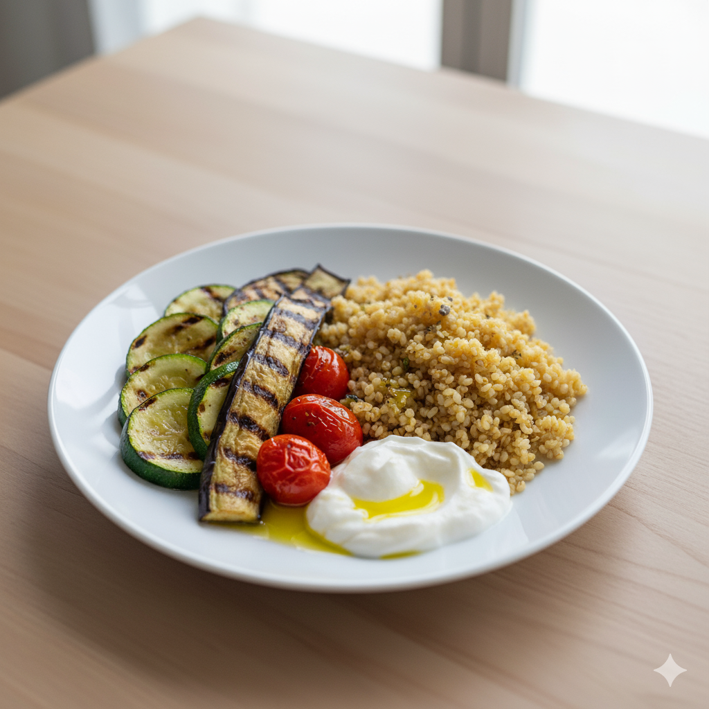 ➤ Örnek tabak: Nohutlu Akdeniz Bowl Közlenmiş sebzeler, nohut, tahinli sos, yeşillik karışımı ve az miktarda ızgara balık dokunuşu. Tam bir bağırsak-dostu, sürdürülebilir beslenme örneği.